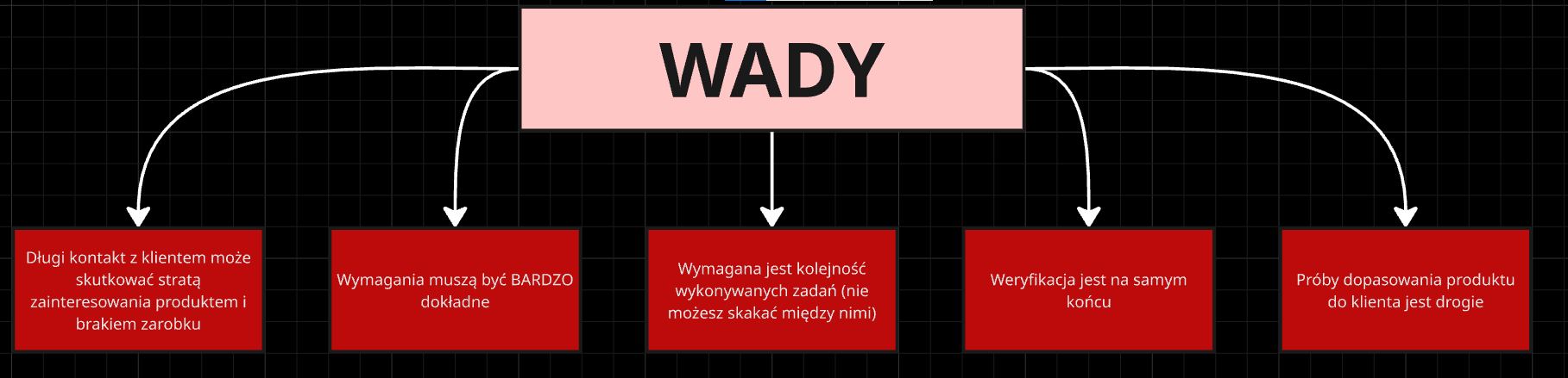 - Próba dopasowania projektu do klienta - jak w punkcie 1. jeśli klient coś zmieni, trzeba będzie wszystko zacząć od 0, a za tym idzie czas, jak i pieniądze